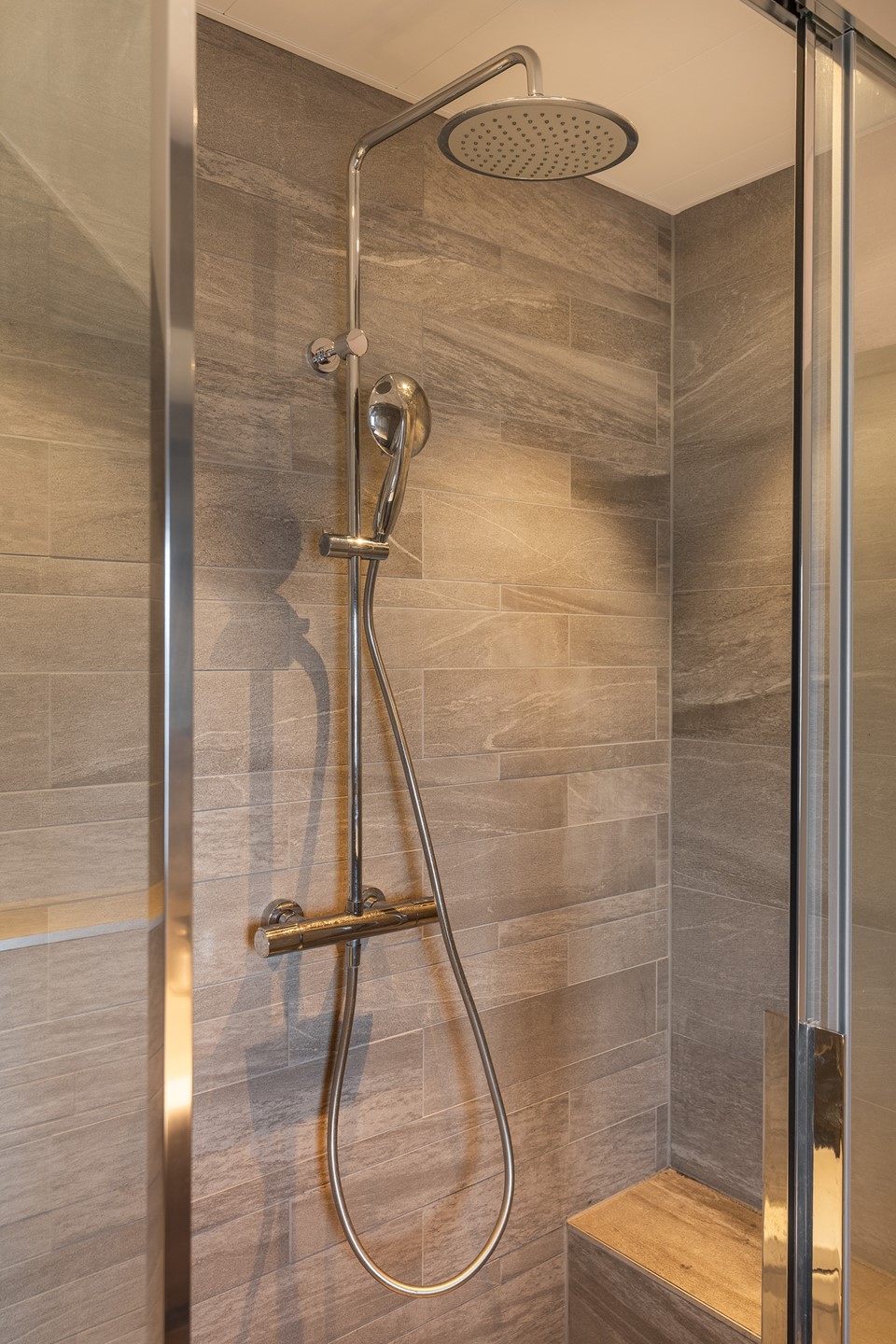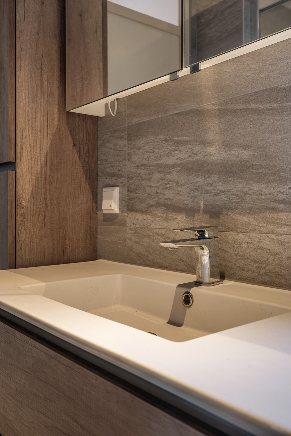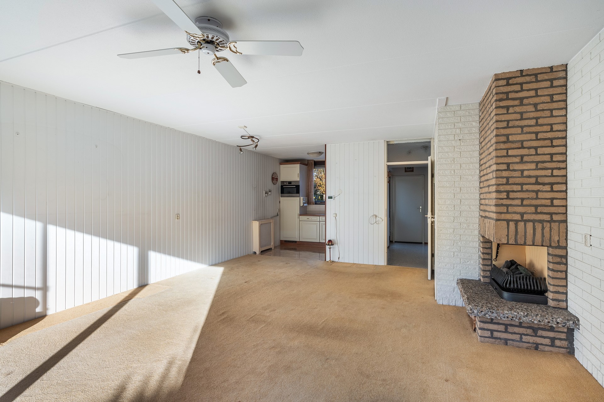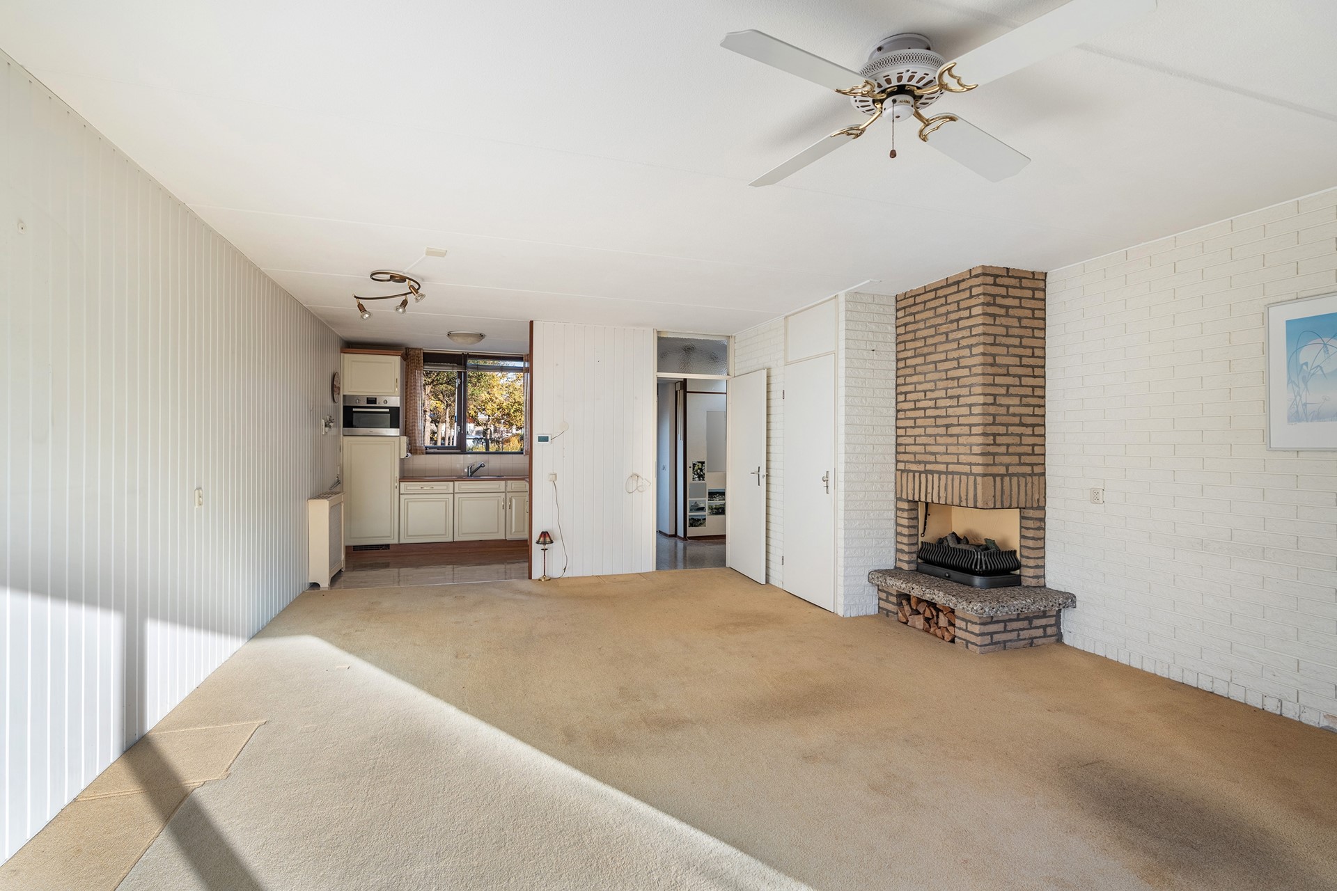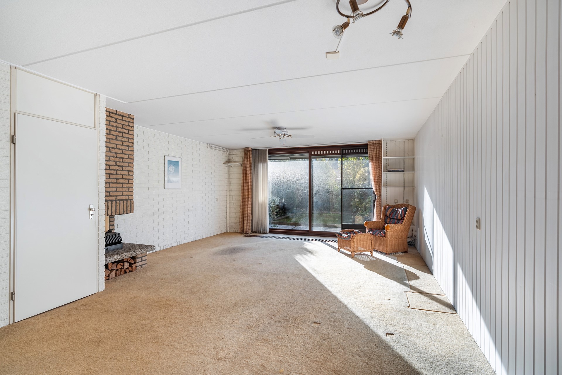 Lichte woonkamer met open haard Wat direct opvalt als je de woonkamer binnenloopt, is de zee aan licht die dankzij de grote aluminium schuifpui naar binnen stroomt. Die pui verbindt binnen met buiten op een manier die bijna doet denken aan zonnige vakantiedagen. De openhaard, nodigt uit tot lange winteravonden met een boek, een borrel en familie dichtbij. Onder de trap schuilt nog een verrassend ruime kast – altijd een uitkomst voor voorraad of kinderspeelgoed.