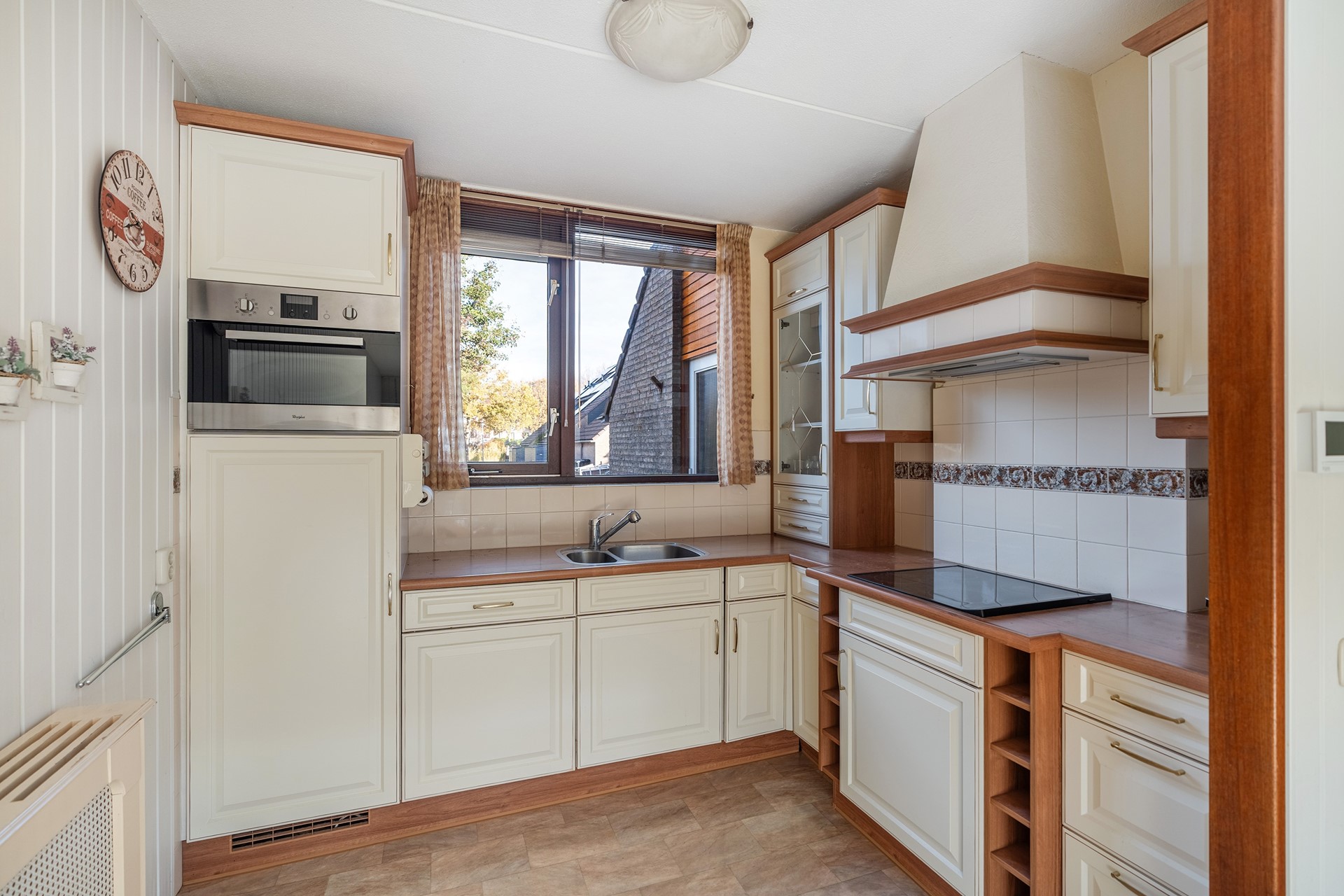 Open keuken met karakter Aan de voorzijde van de woning vind je de keuken die in de afgelopen 25 jaar haar eigen karakter heeft opgebouwd. Maar daar draait het hem juist om: het is een plek waar geleefd is, gekookt, gelachen en gedeeld. Alles wat je nodig hebt is aanwezig, van een combimagnetron tot een keramische kookplaat, een ruime vaatwasser en afzuigkap.