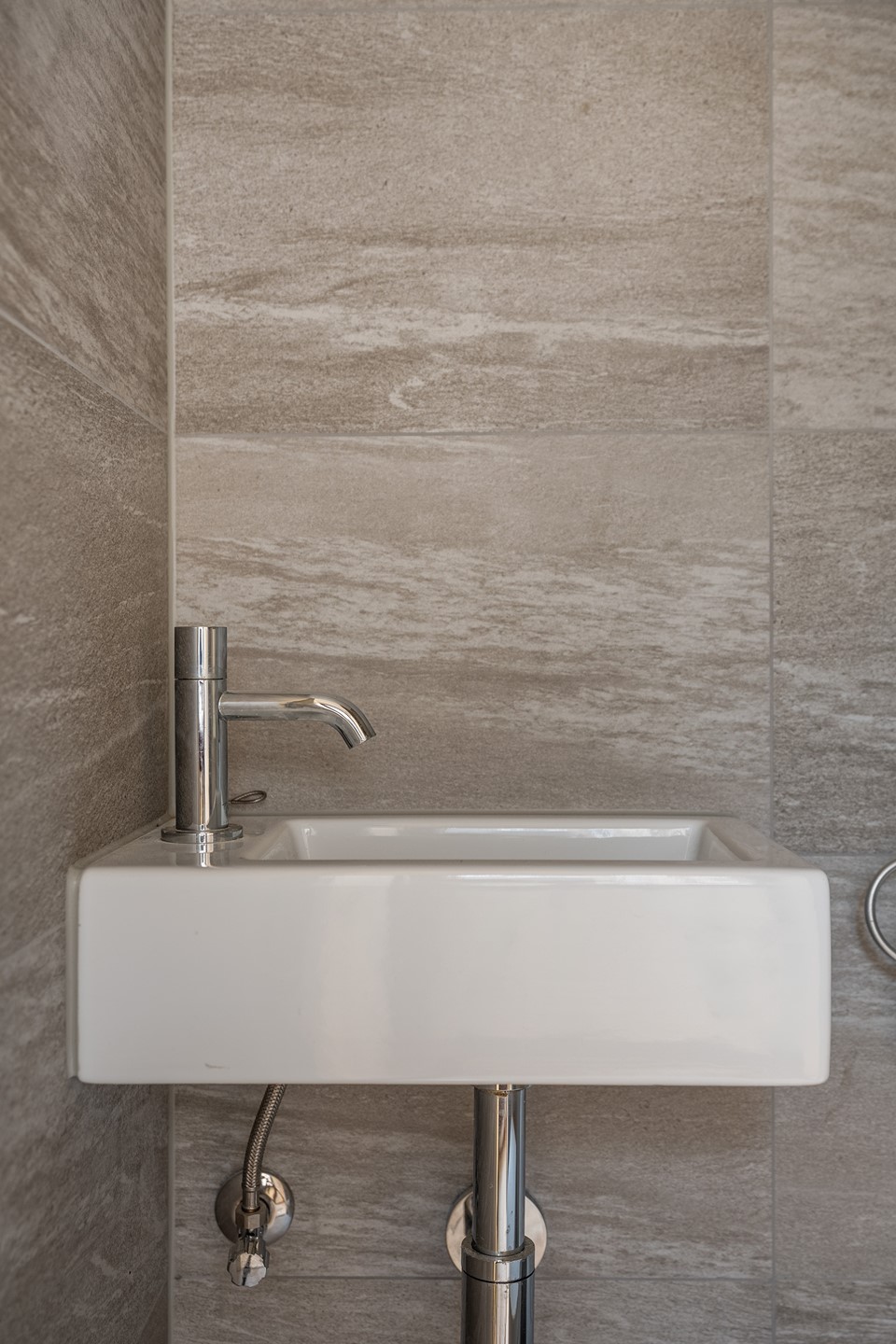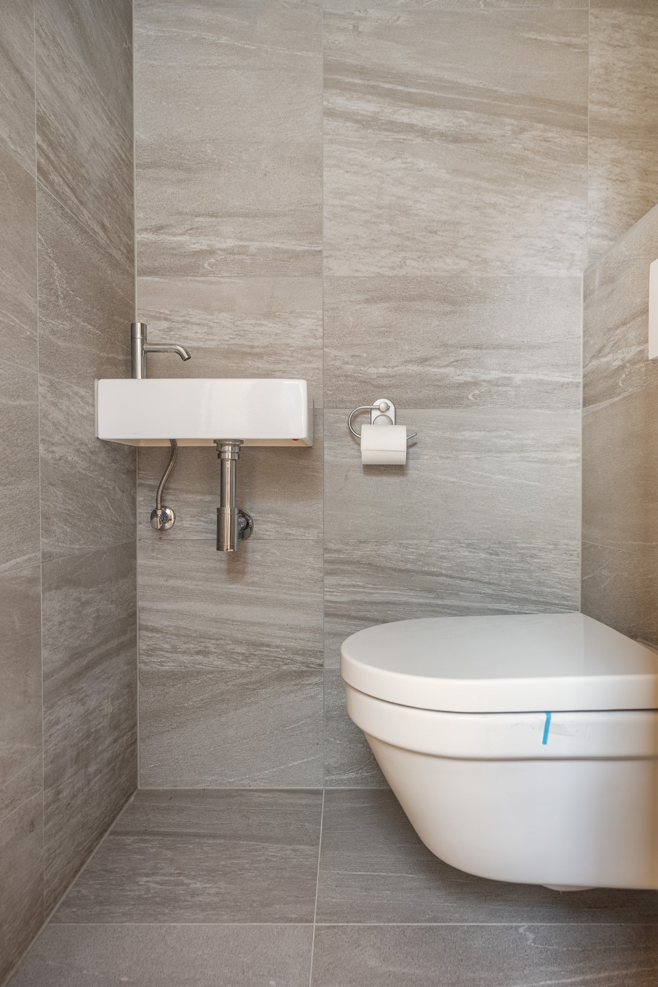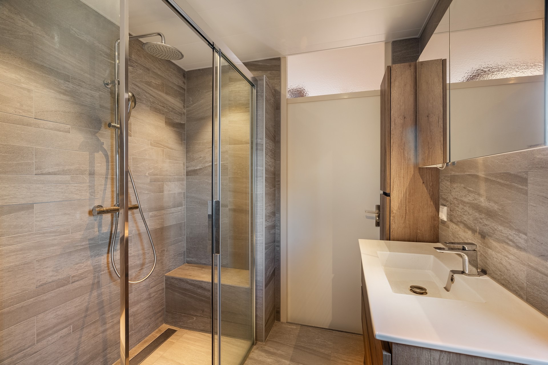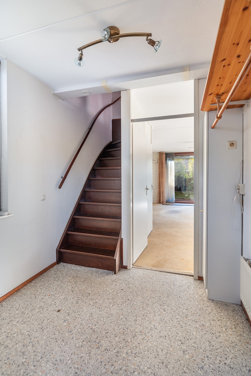 Eenmaal aangekomen open je de deur en stap je de hal binnen waar alles logisch op z’n plek zit: aan je linkerhand vind je een super praktische berging (altijd handig voor fietsen of extra voorraad!) en meteen daarnaast de modern afgewerkte toiletruimte. De trap leidt je soepel naar boven, terwijl de lichte woonkamer je eigenlijk al roept.