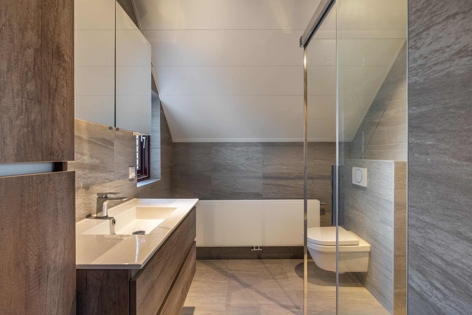 Drie royale slaapkamers en een moderne badkamer Even de trap opstappen naar de eerste verdieping, waar drie volwaardige slaapkamers klaarstaan om ingevuld te worden als ouderkamer, kinderkamers, werk- of hobbyruimte. De ouderslaapkamer heeft ook nog eens toegang tot een eigen balkon, ideaal als je graag even je hoofd buiten de deur steekt in de ochtendzon. Verder vind je op deze etage een moderne badkamer, compleet met een inloopdouche met schuifdeur, een zwevend toilet en een praktisch wastafelmeubel met spiegelkast en extra bergruimte. Hier kom je echt tot rust na een drukke dag.