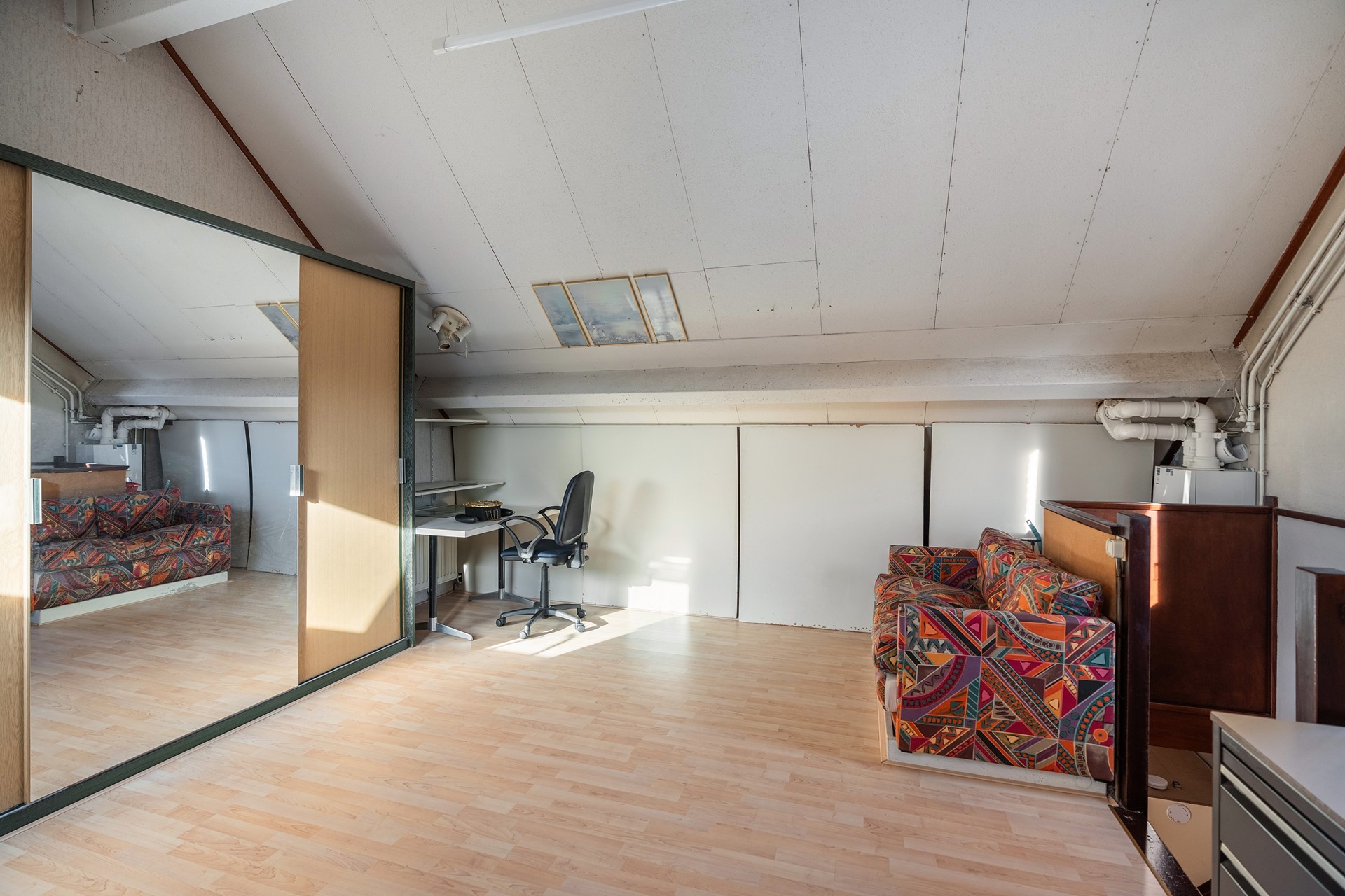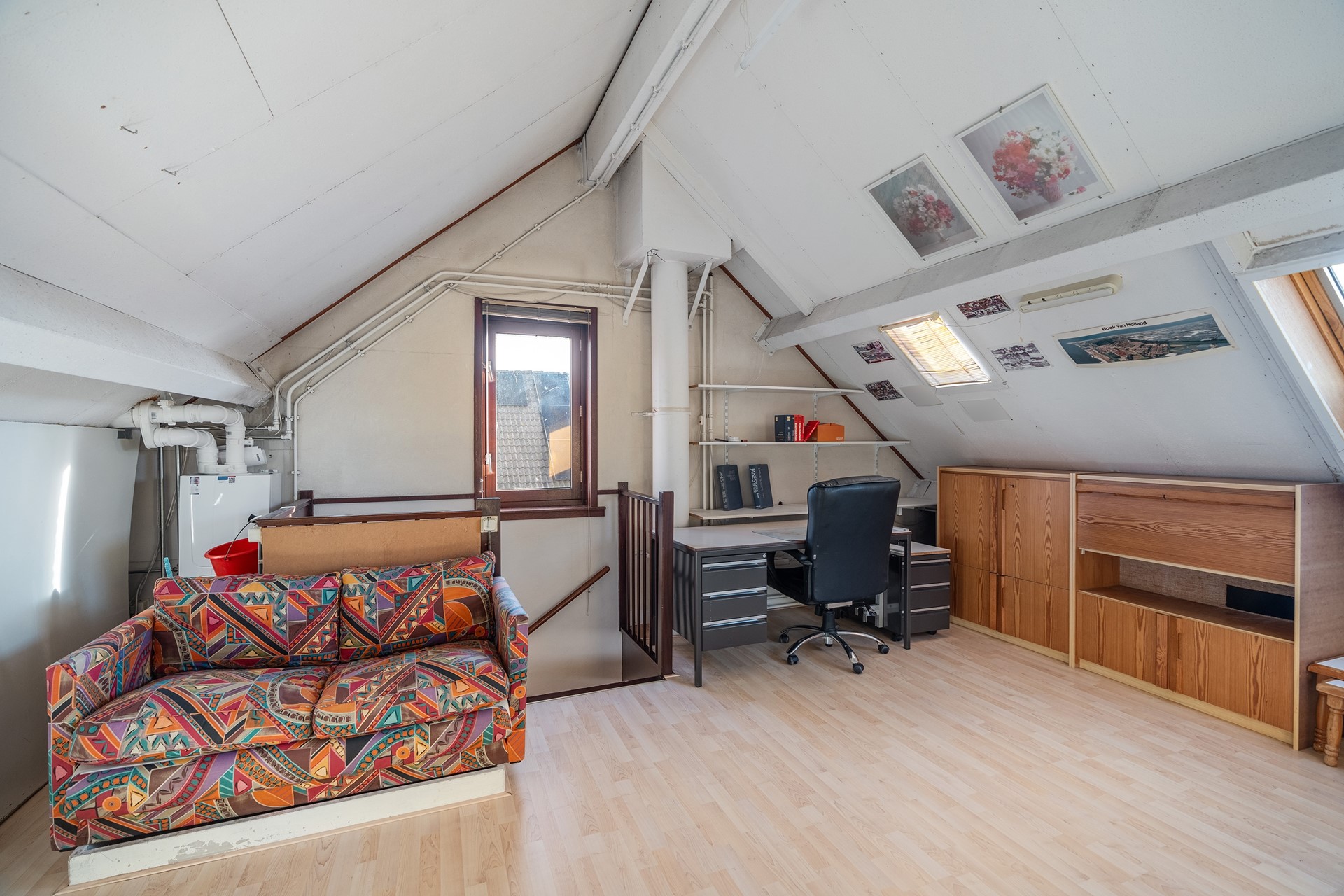 Mega grote zolder: jouw droomruimte De tweede verdieping? Die is werkelijk riant. Denk groot! Of je nu behoefte hebt aan nóg meer slaapkamers, die lang gewenste thuiswerkplek, een speelzolder of misschien een creatieve studio: het kan allemaal, want deze ruimte biedt bijna oneindig veel mogelijkheden. Met twee dakramen plus een zijraam geniet je hier bovendien van volop daglicht. Verder tref je hier de CV-opstelling en handige wasmachine-aansluiting.