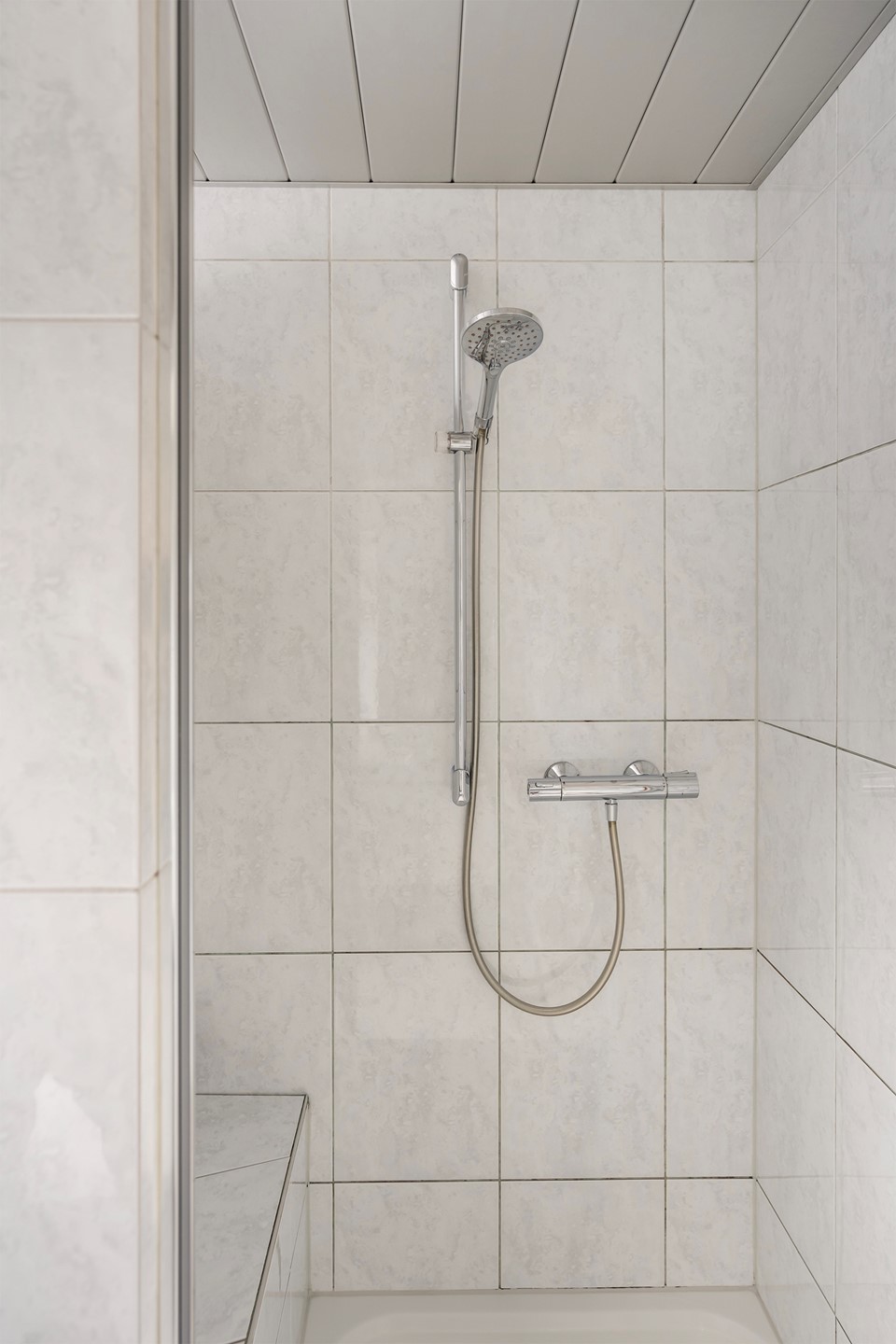 Complete badkamer De badkamer is ruim en compleet uitgevoerd met een groot ligbad, aparte douche, wastafelmeubel en toilet. De witte wandtegels in combinatie met zwarte accessoires geven de ruimte een frisse, tijdloze uitstraling.