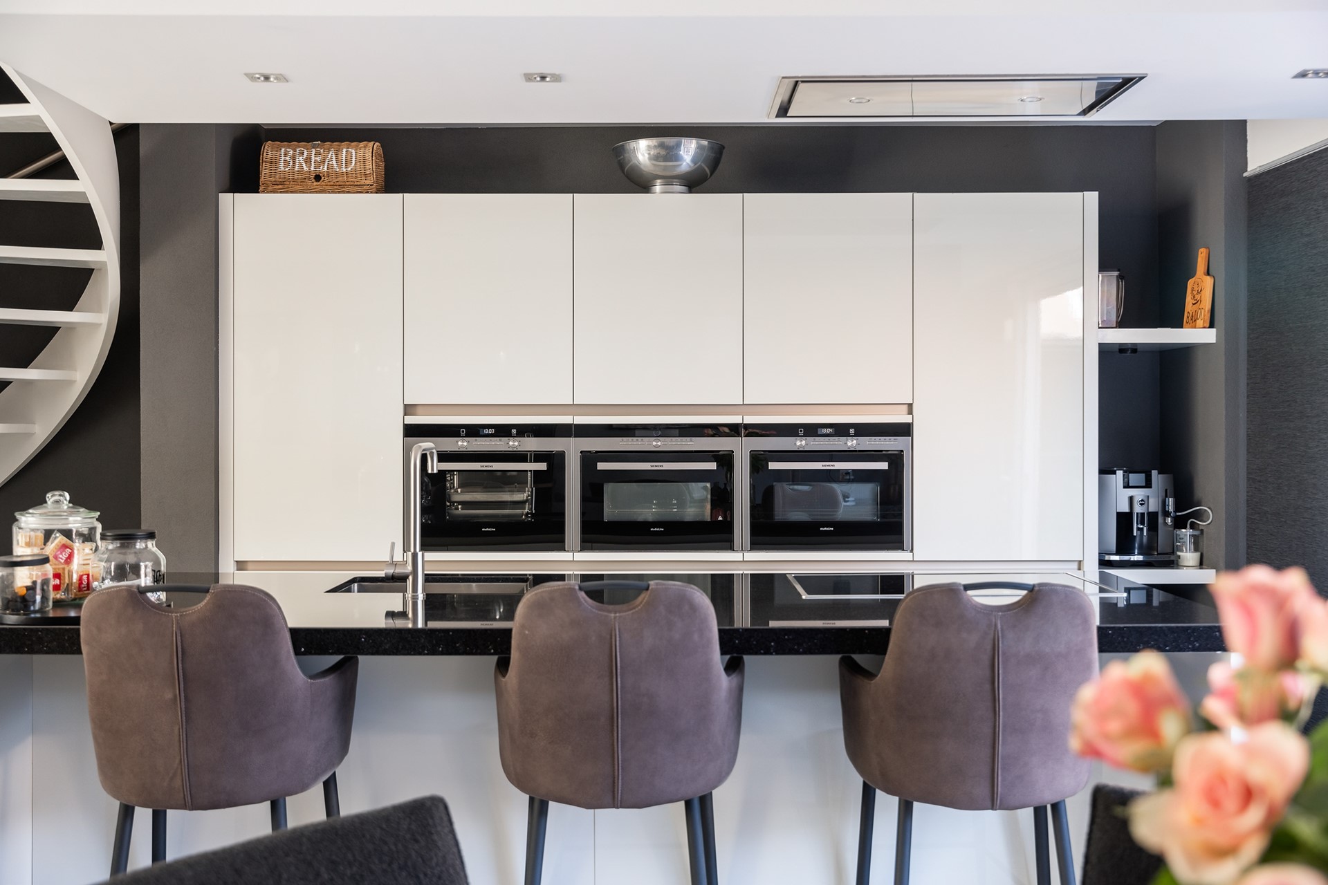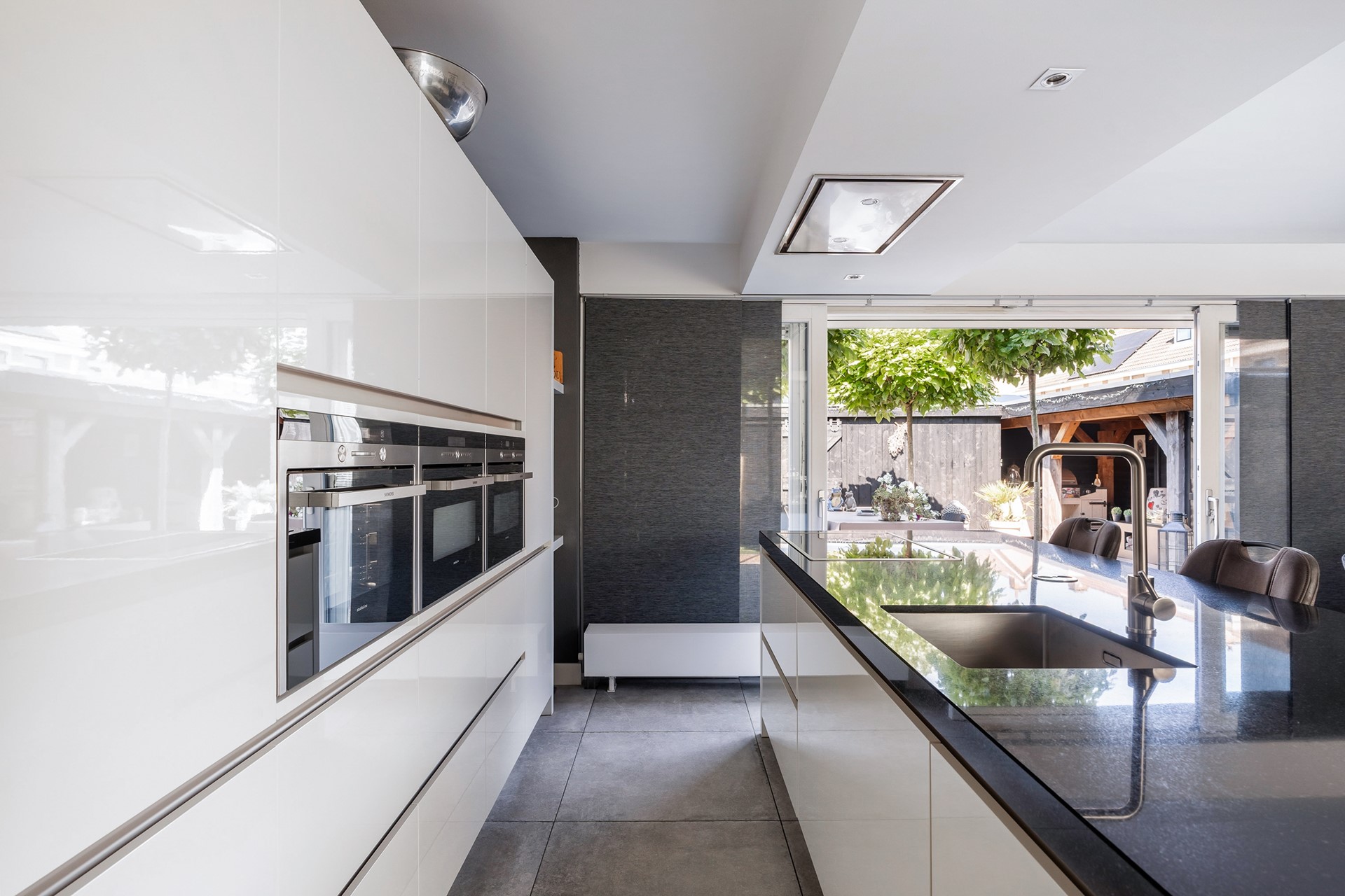 Luxe woonkeuken met wow-factor De keuken is absoluut het kloppend hart van deze woning, uitgevoerd in stijlvol wit en van alle moderne gemakken voorzien. Liefhebbers van koken kunnen hun hart ophalen: het kookeiland heeft niet alleen plek voor drie barkrukken – ideaal voor een goed gesprek terwijl jij nog de laatste hand aan het diner legt – maar ook is werkelijk aan alles gedacht qua apparatuur. Denk aan een inductiekookplaat met vijf zones, stoomoven, geavanceerde grill- en magnetronfuncties, ruime koelkast en een aparte vriezer, vaatwasser, en een efficiënte afzuigkap van Siemens. Kortom, hier ontbreekt niets aan comfort en gebruiksgemak!