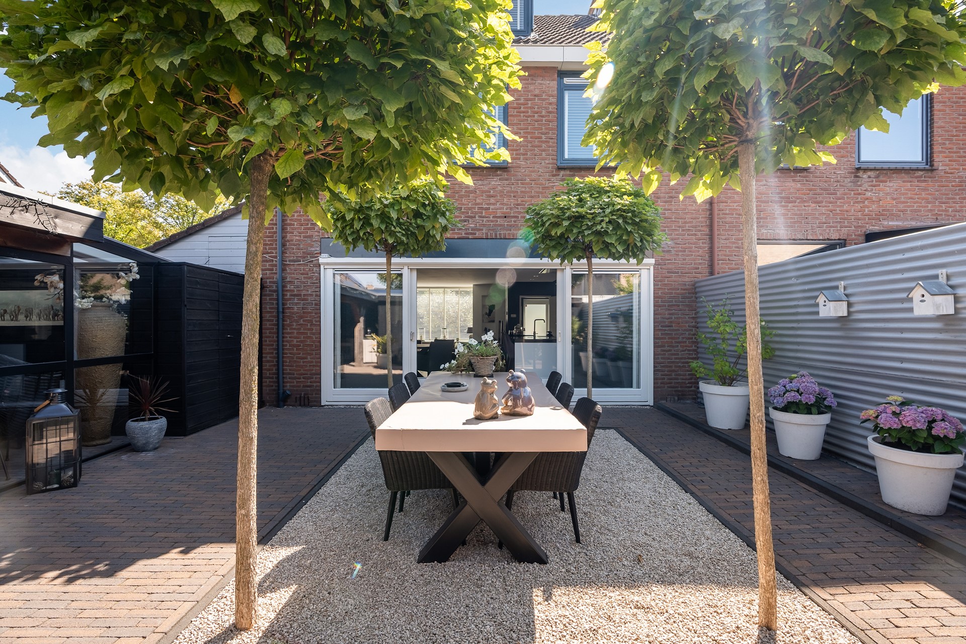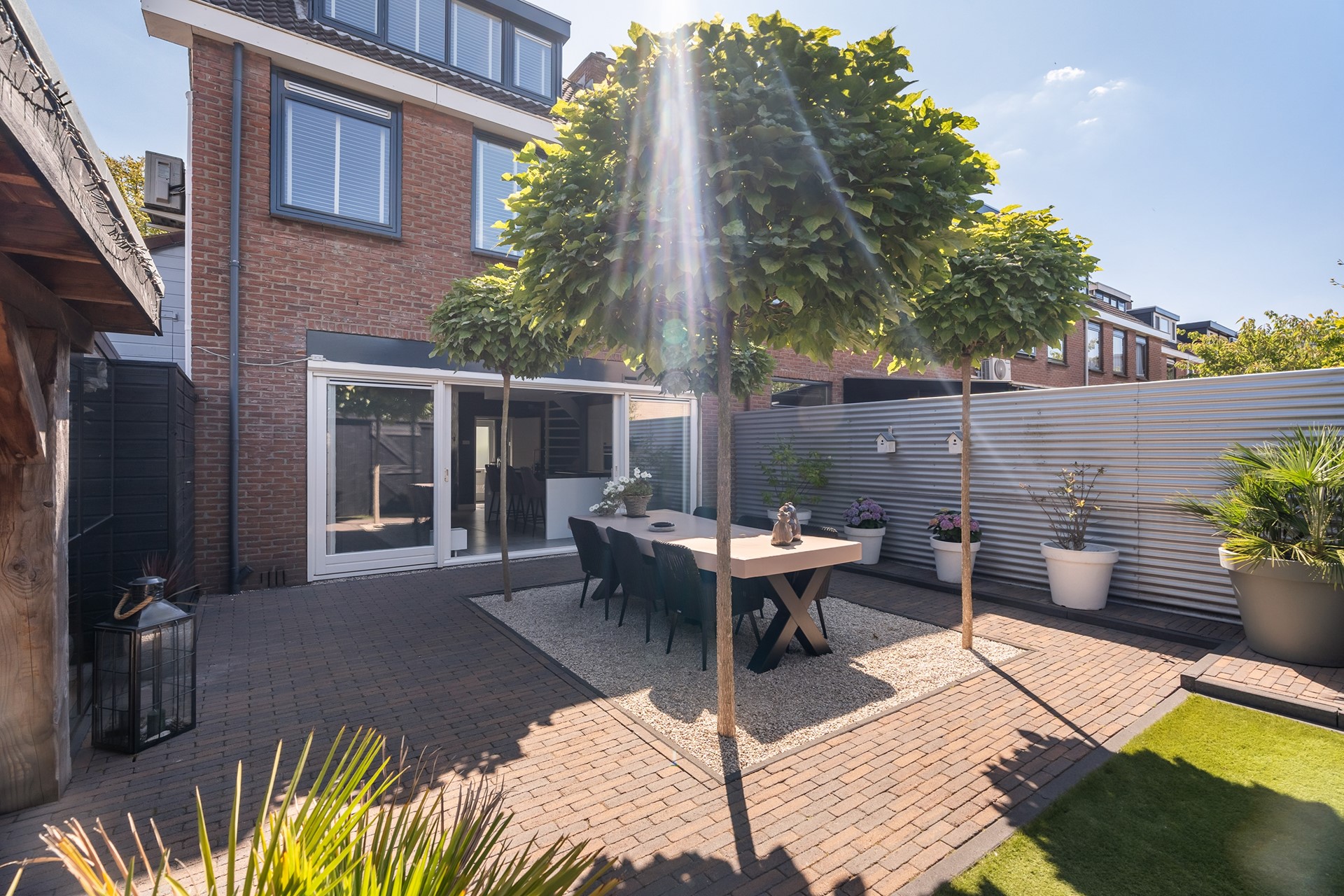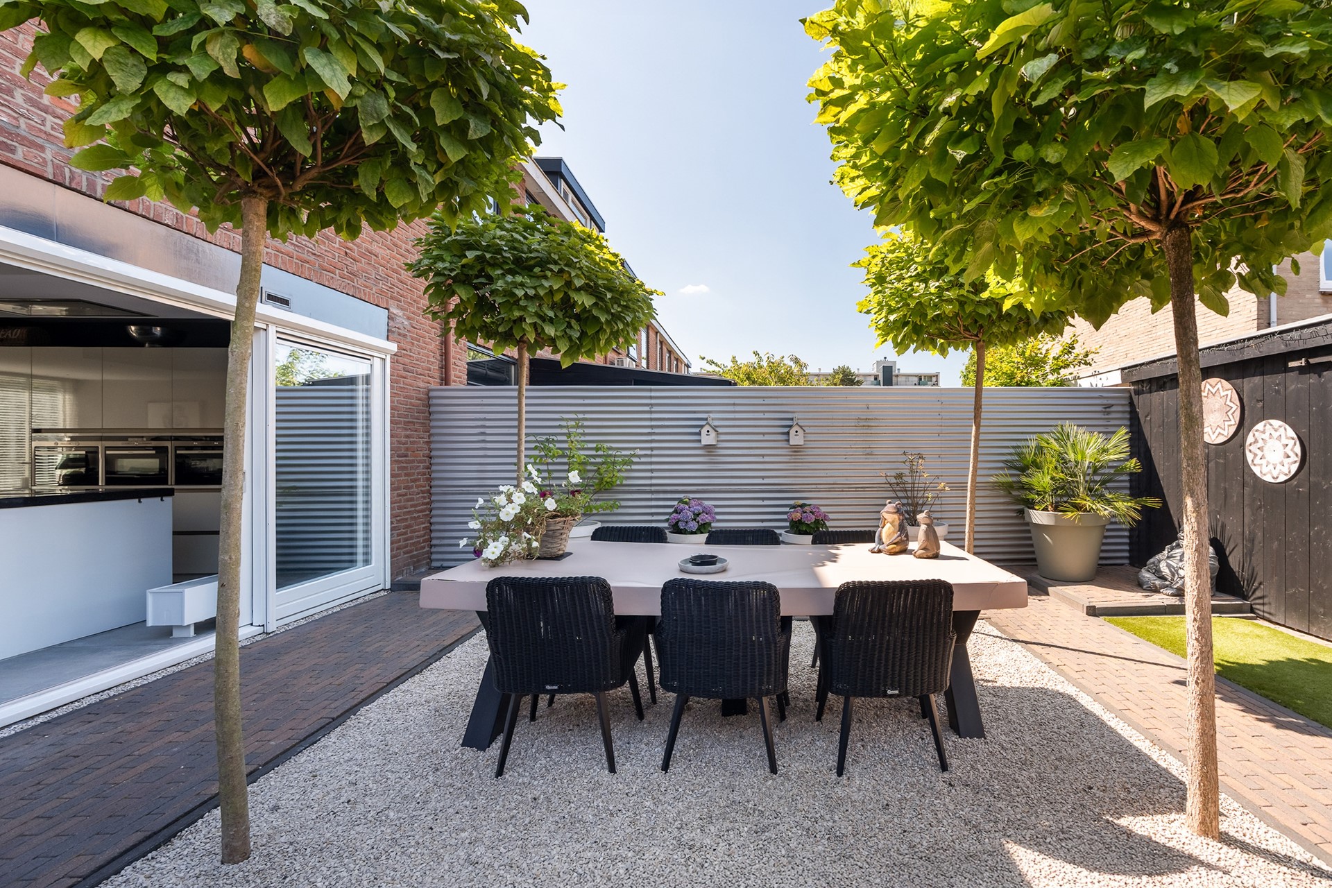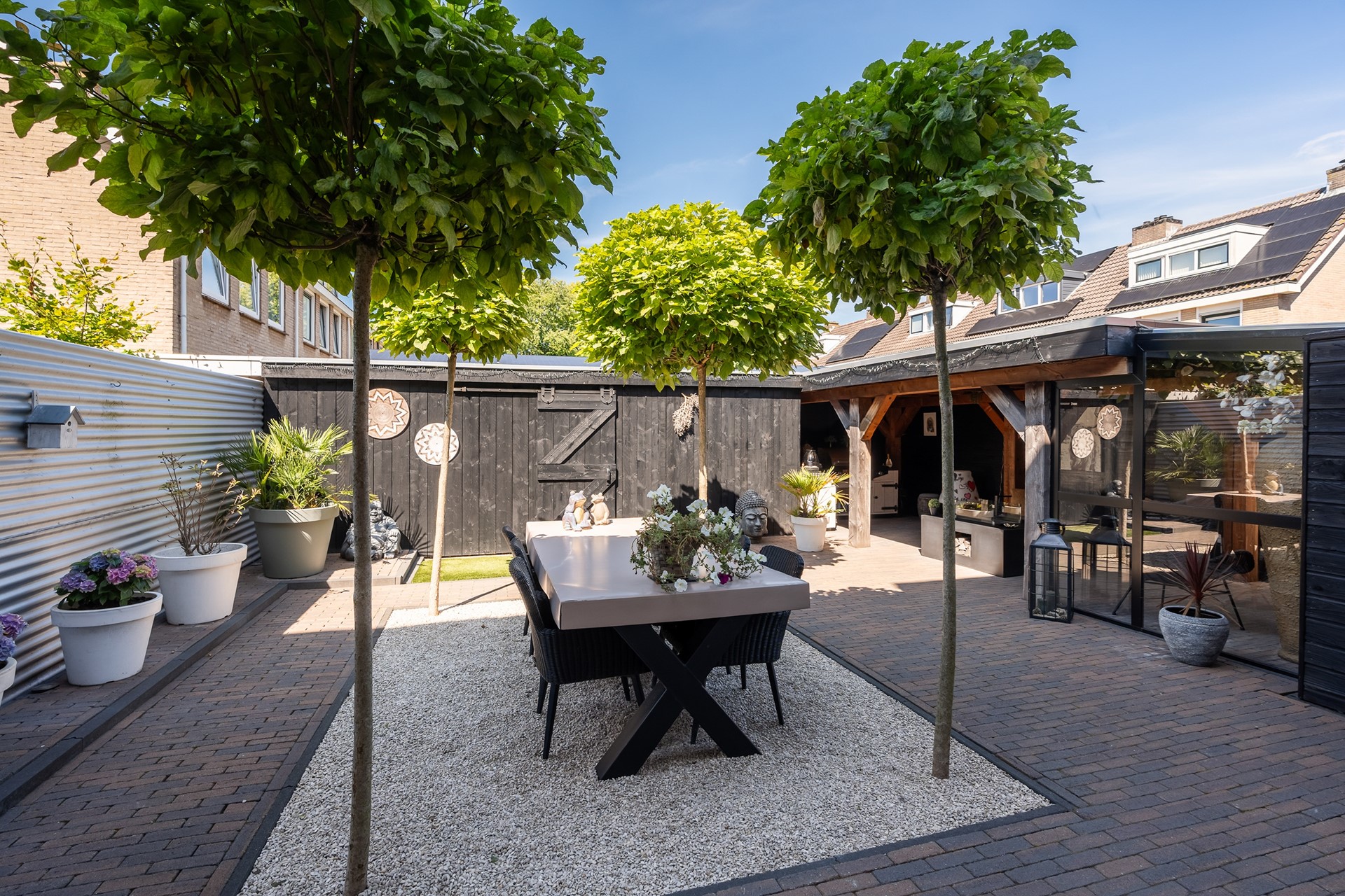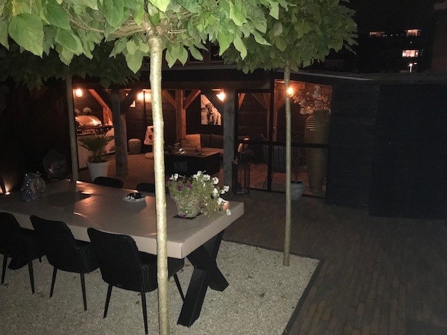 Buitenleven op z’n best: tuin met overkapping en buitenkeuken En dan, ja hoor... De tuin – wat een parel! Deze achtertuin is knus gesitueerd voor optimale privacy en voorzien van alle denkbare luxe. Of je nu met een groot gezelschap wilt dineren onder de gezellige overkapping, uitgebreid wilt barbecueën of gewoon lekker wilt genieten van een zwoele avond, hier kan het allemaal. Aan tafel met vrienden, de buitenkeuken paraat en voor de lange zomeravonden biedt de overkapping uitkomst. Eigenlijk wil je nergens anders meer zijn! De voortuin is trouwens minstens zo fraai, perfect onderhouden en speels aangelegd.