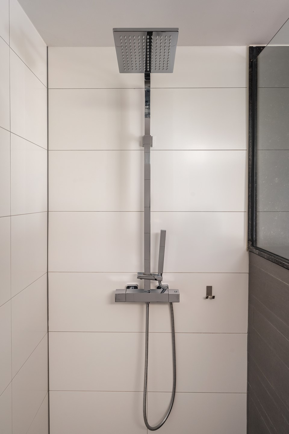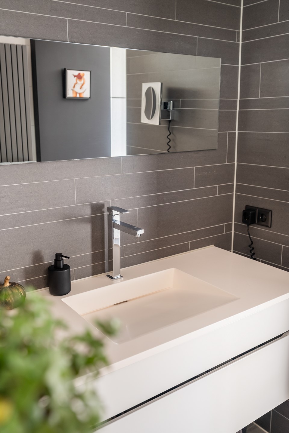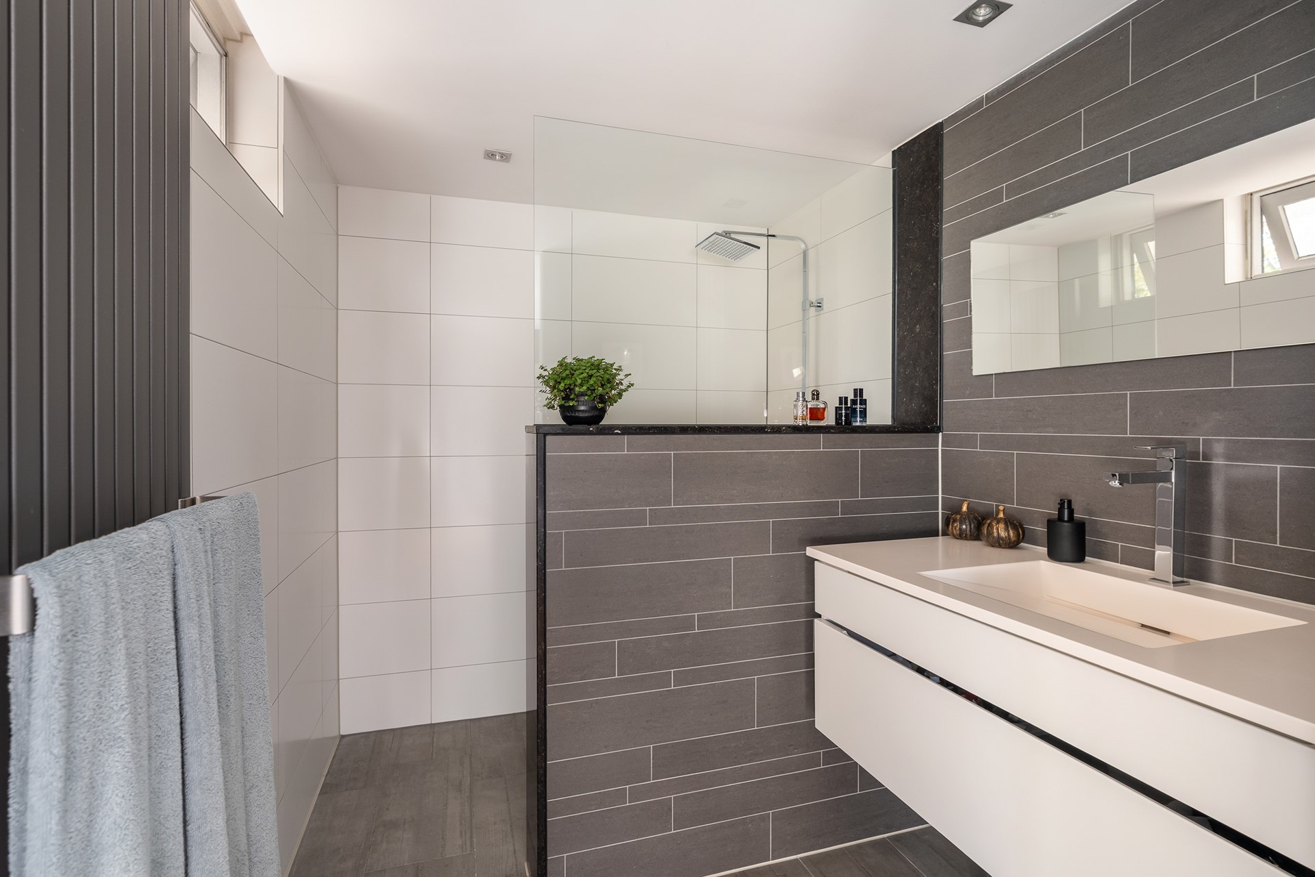 Eerste verdieping – Luxe slapen & douchen Via de trap kom je op de eerste verdieping: een heuse master suite die zich uitstrekt over de gehele etage. Slapen doe je hier koninklijk! Aan de voorzijde vind je een moderne badkamer voorzien van trendy witte en grijze tegels, lange wastafel, luxe inloopdouche, sfeervolle inbouwspots en een extra raampje voor heerlijk daglicht. Alles klopt: van de fraaie spiegel tot de warme handdoekradiator voor dat extra beetje comfort.