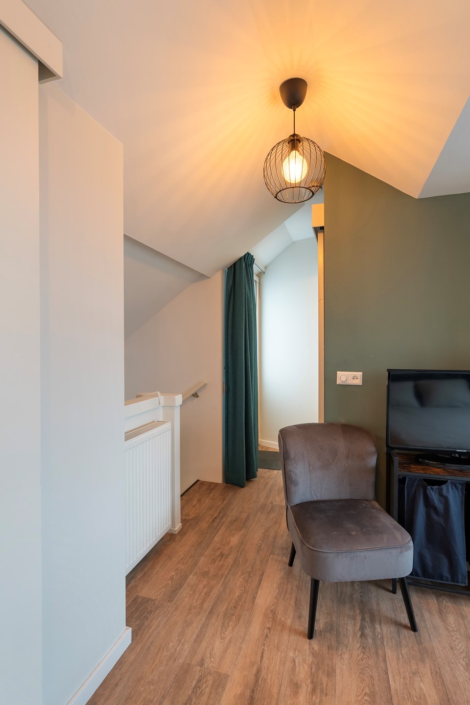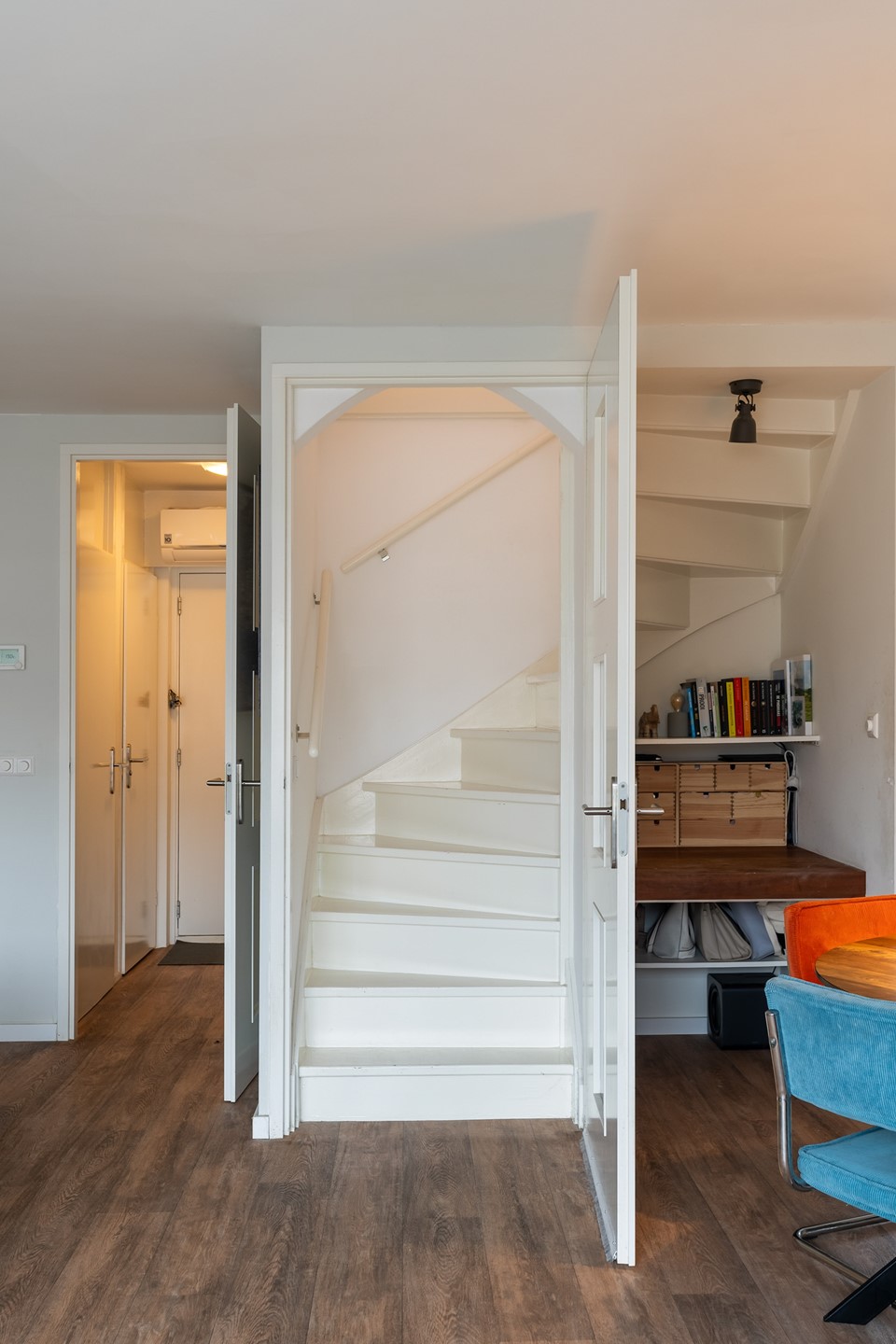 Dit exclusieve appartement is een ware maisonnette, verdeeld over twee verdiepingen, die je bereikt via een prachtig vormgegeven houten trap. De gehele woonlaag bevindt zich op de eerste etage en zodra je bovenkomt, ervaar je direct de intimiteit en geborgenheid die deze privé-etage kenmerkt.