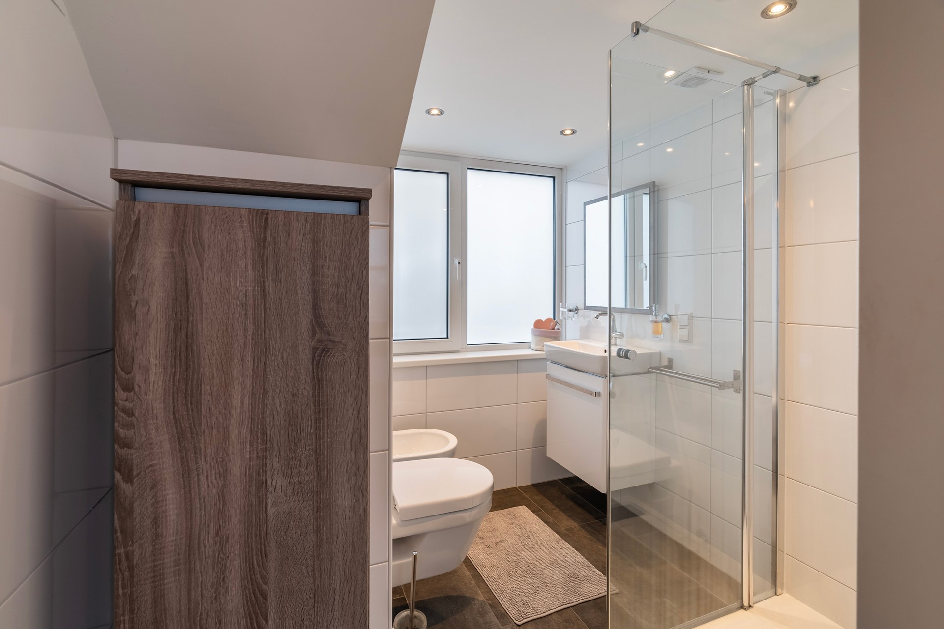 Vanuit je slaapkamer stap je direct je eigen luxe badkamer in, waar het natuurlijke daglicht je elke ochtend tegemoet komt. Deze zonovergoten wellness-ruimte is van alle gemakken voorzien, inclusief een royale inloopdouche, een tweede zwevend toilet en een bidet.