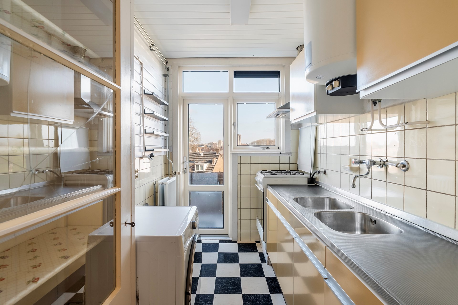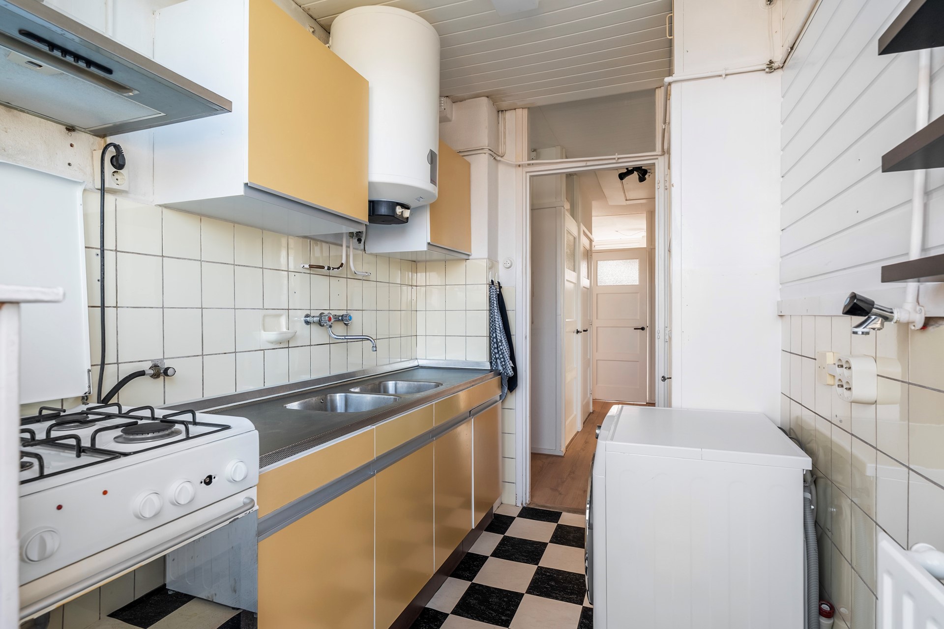 Vintage droomkeuken: Voor de liefhebber is de keuken een absoluut pronkstuk. Het betreft een originele Bruynzeel-keuken die perfect past bij de tijdsgeest van het pand. De keuken is functioneel ingericht met een gaskookplaat, boiler en koel-vriescombinatie.