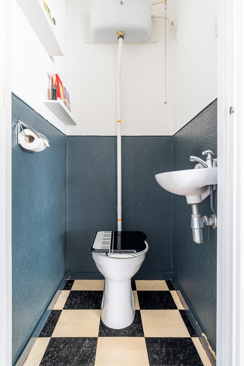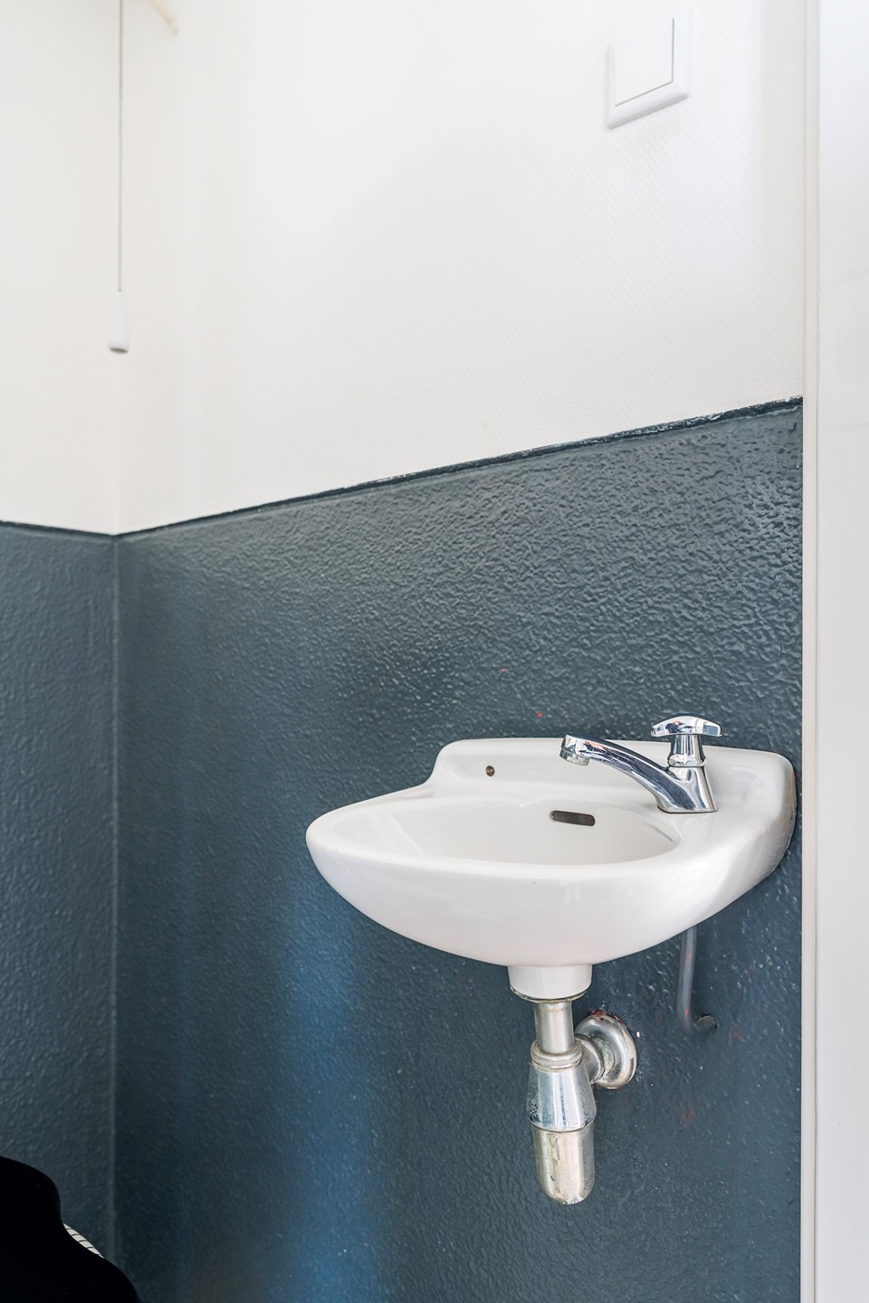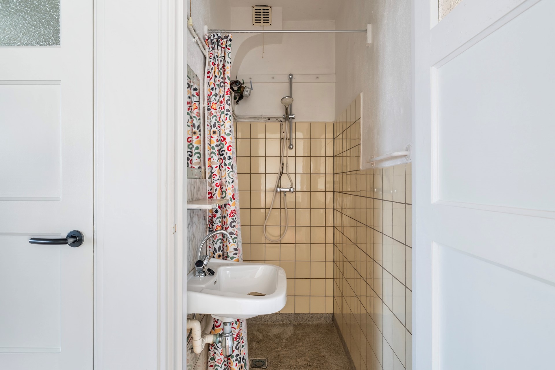 Terwijl het toilet met fonteintje keurig is onderhouden, biedt de eenvoudige badkamer (waarvan de wastafel momenteel defect is) de uitgelezen kans om een moderne doucheruimte te creëren, geheel naar eigen smaak en ontwerp.