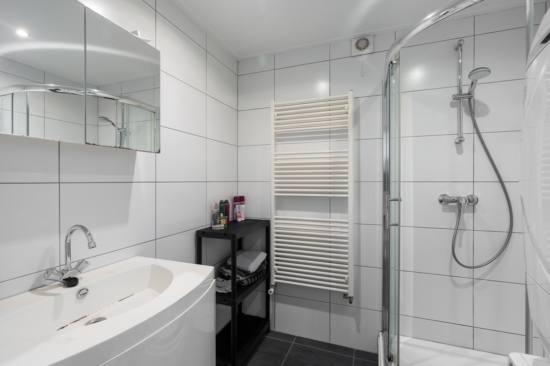 Verfrissend sanitair De badkamer is uitgevoerd in een tijdloze, neutrale kleurstelling en beschikt over een douchecabine en een wastafelmeubel met extra opbergruimte. Ook de aansluitingen voor de wasmachine en droger zijn hier praktisch opgesteld. Het separate toilet is in dezelfde stijl betegeld en voorzien van een fonteintje.