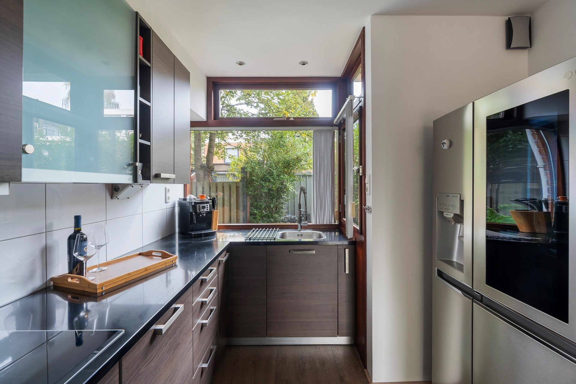 Een Keuken Om Van te Dromen Voor iedereen die graag kookt of gezellig samenkomt, is de keuken een waar feestje. Hier vind je werkelijk alles wat je hartje begeert: moderne apparatuur, zoals inductiekookplaat, combimagnetron, vrieskast, afzuigkap een composiet aanrechtblad met voldoende werkruimte en een slimme indeling. De grote losse koel-vries combinatie is voorzien van een glazendeur, heeft water, ijsblokjes en crushed ijs.