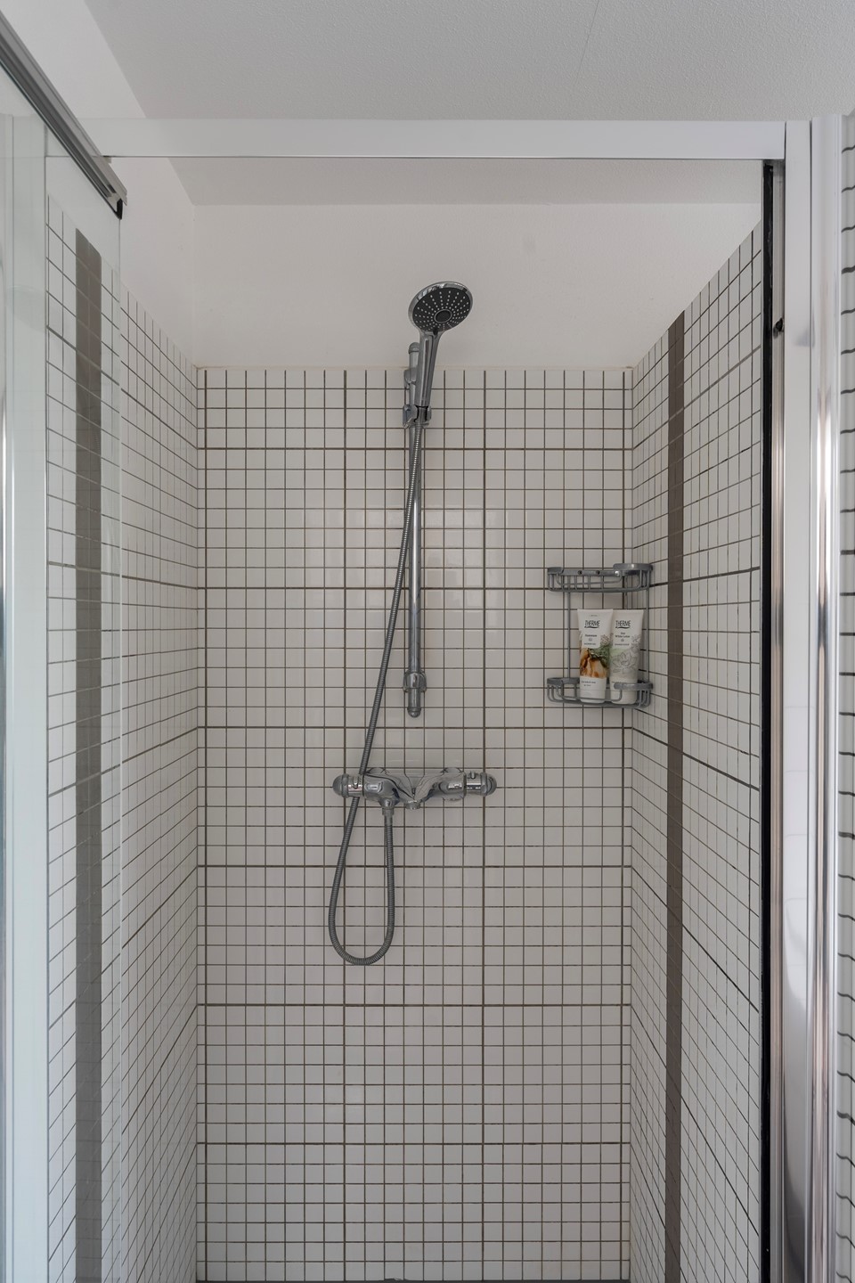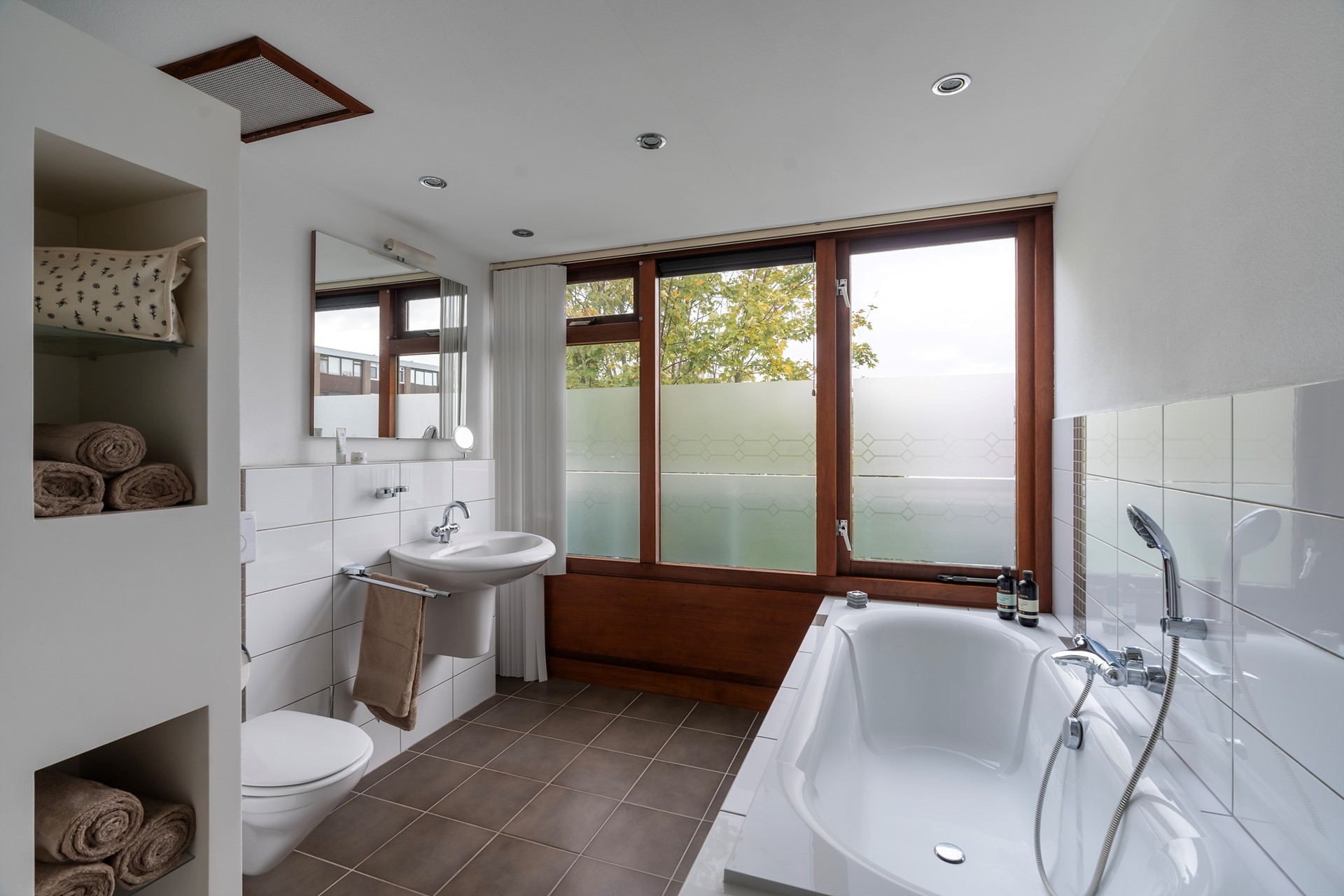 Badkamer met Luxe Uitstraling Na een drukke dag is het hier heerlijk ontspannen. De badkamer is uitgerust met een royaal ligbad, een ruime douchecabine, modern wastafelmeubel en, als kers op de taart, ook hier comfortabele vloerverwarming. De stijlvolle betegeling en het doordachte ontwerp maken van deze ruimte een ware wellness.